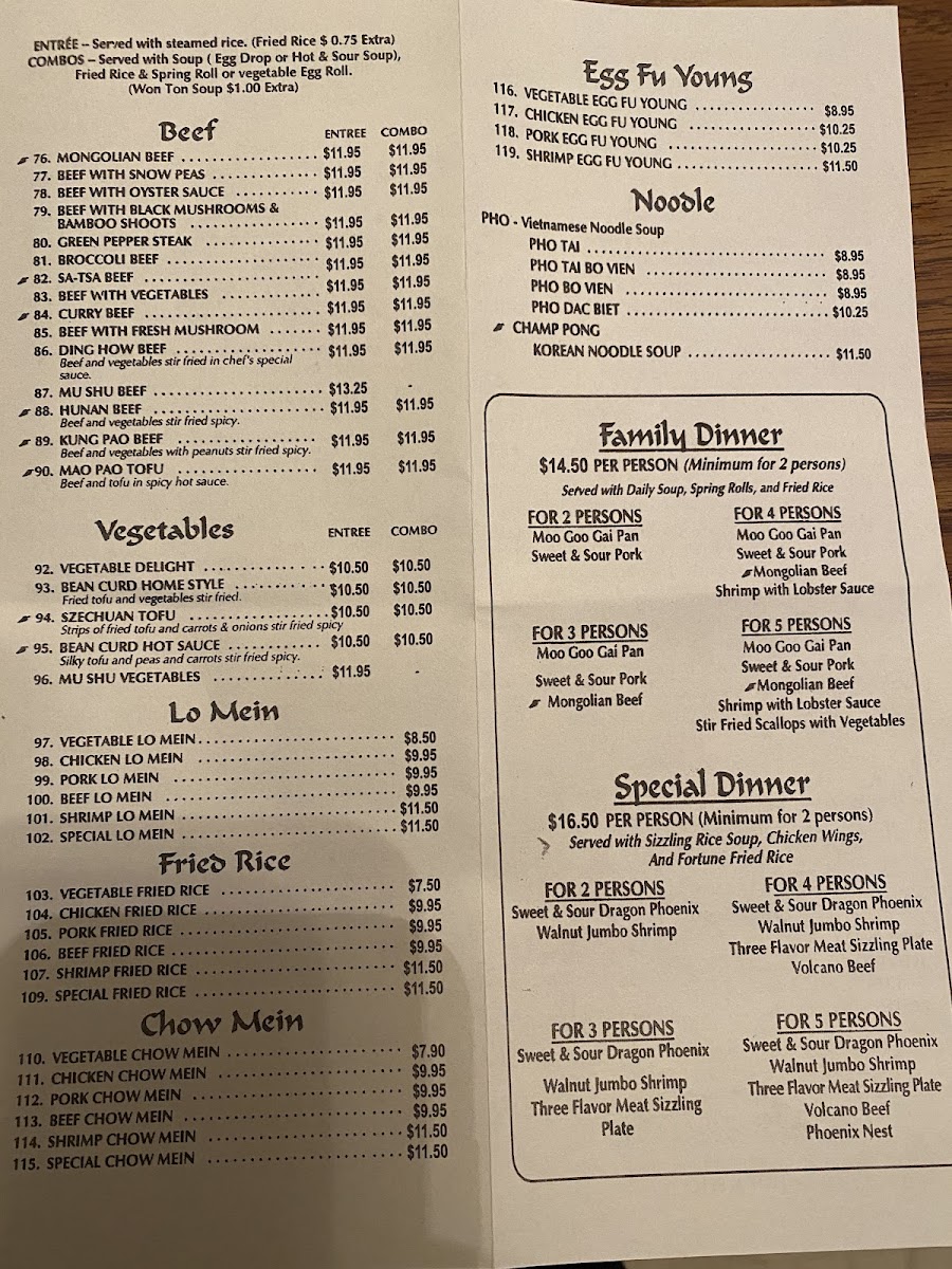 The Hong Kong Style Luncheon category offers a range of noodle and rice dishes, such as Beef Chow Ho Fun in different variations, Singapore Fried Rice Noodle, Pan Fried Noodles with assorted ingredients like beef or seafood, and a Hong Kong Special Fried Rice. These dishes are priced individually and provide a variety of flavors consistent with Hong Kong-style cooking.