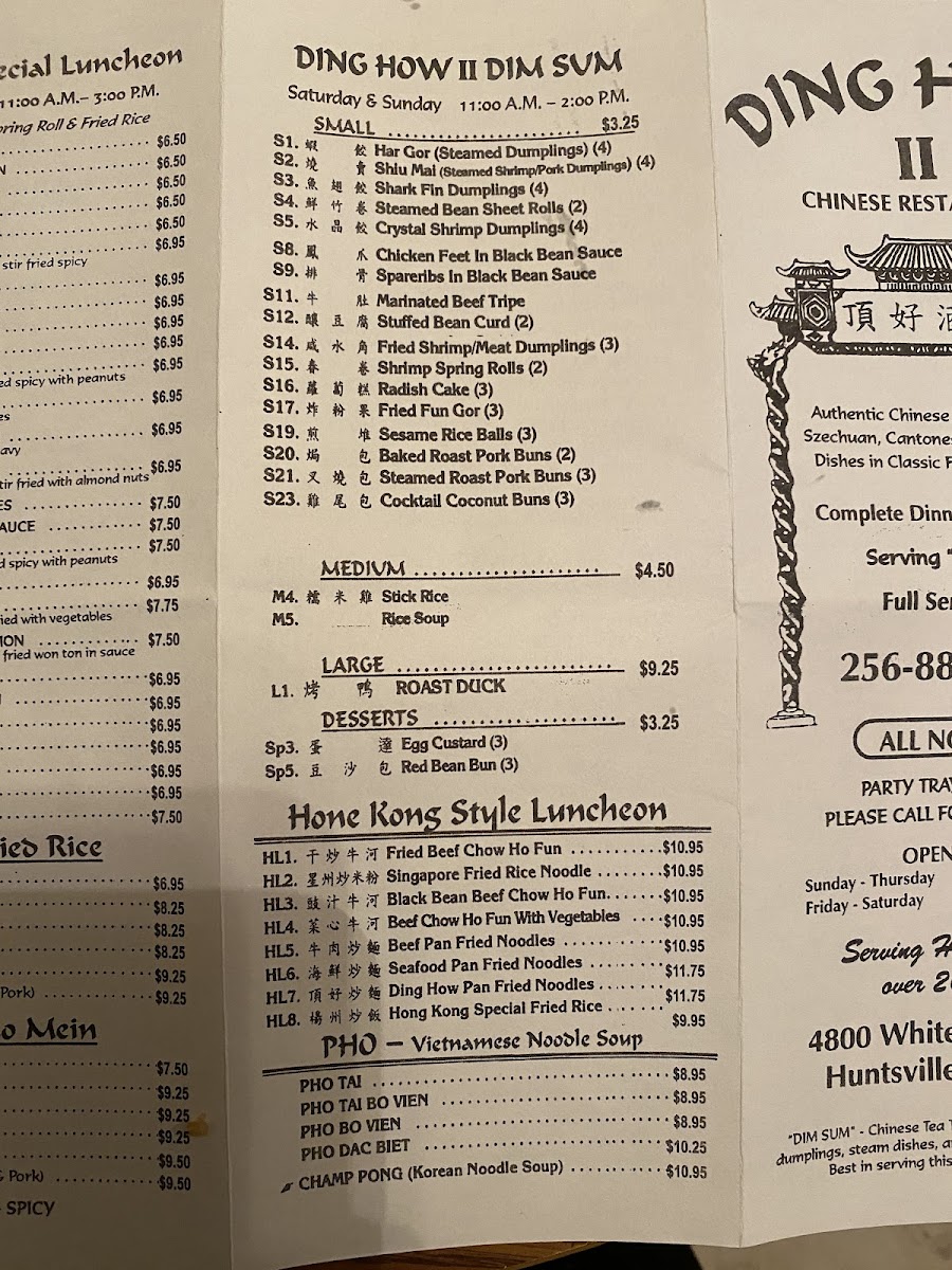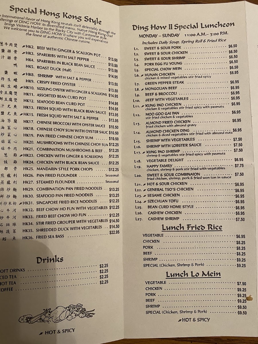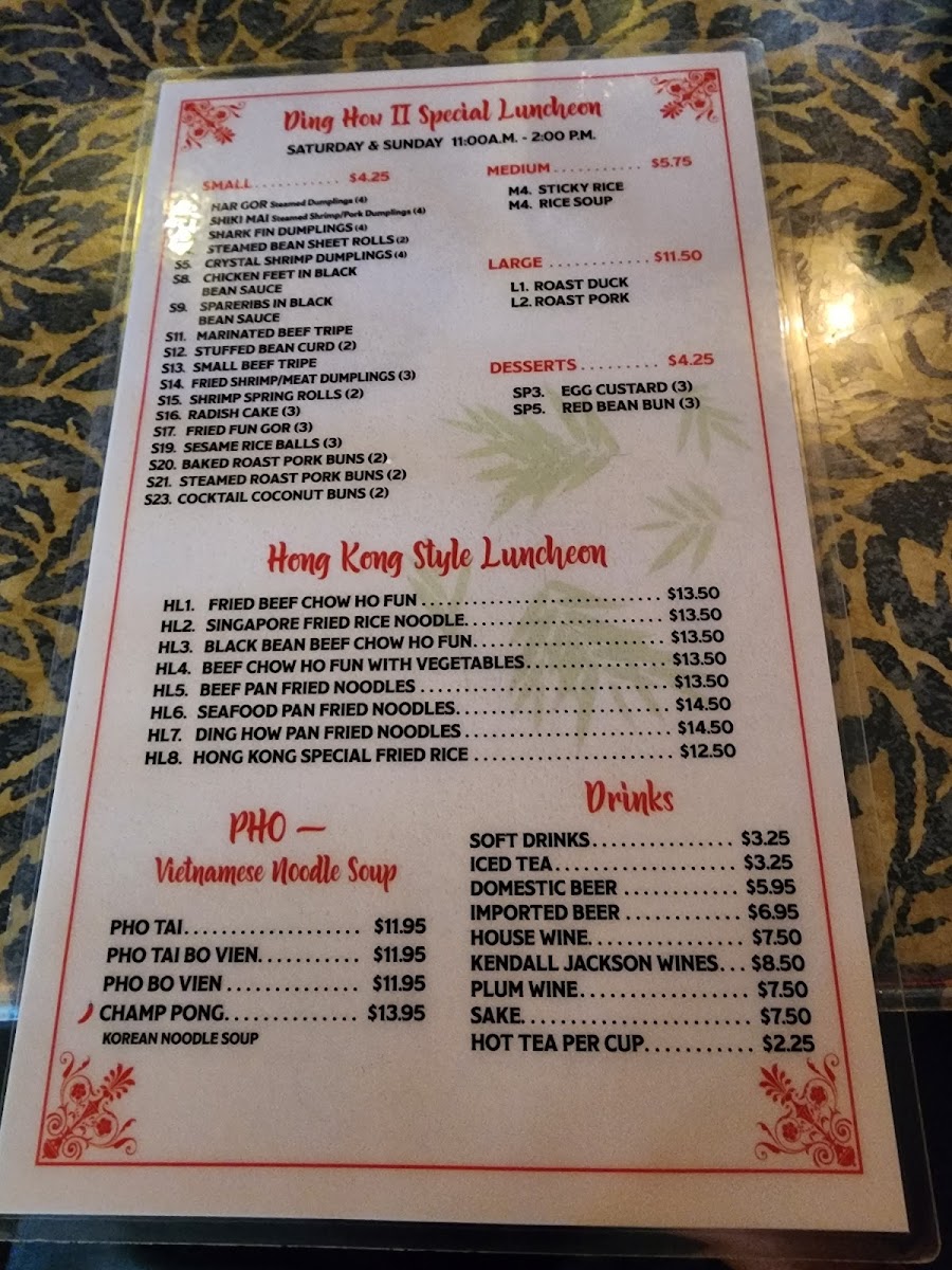 The menu at Ding How II features a selection of traditional Chinese dishes, with a focus on Cantonese-style cuisine. It is organized into several categories, including Dim Sum Desserts, Hong Kong Style Luncheon dishes, and a variety of drinks.